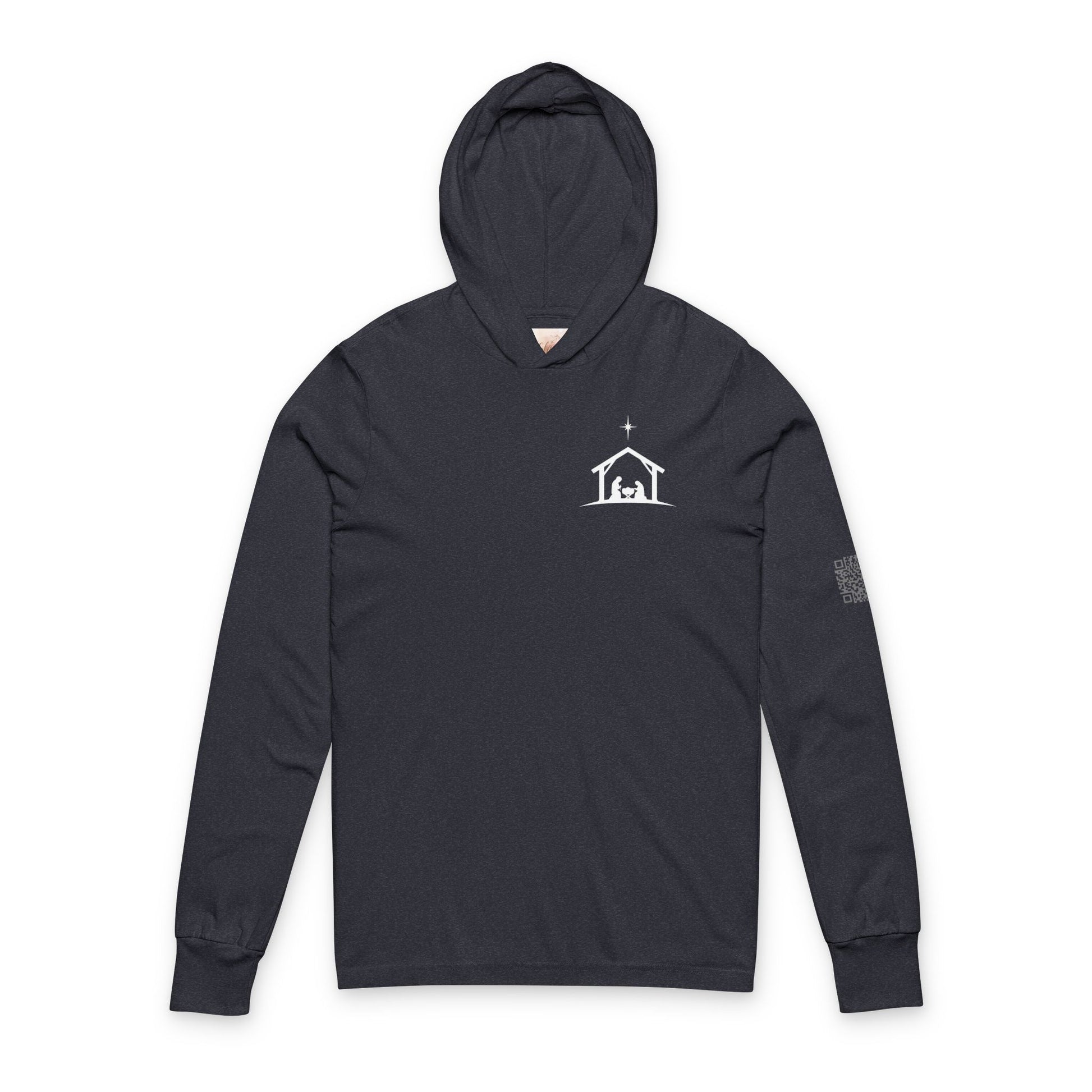 Lightweight hooded long-sleeve tee designed for quiet moments and gentle witness. The simple nativity emblem on the chest and the subtle text across the back—Still Emmanuel, God With Us—feel like a soft reminder to breathe, reflect, and gather close. Wear it layered over a tee or under a jacket on cool mornings as you head to a candlelit service, weekend coffee catch-up, or an intimate family celebration. The muted design keeps the message humble and wearable, while the hood and long sleeves add a calm, cozy edge that fits both church nights and slow Sunday mornings.